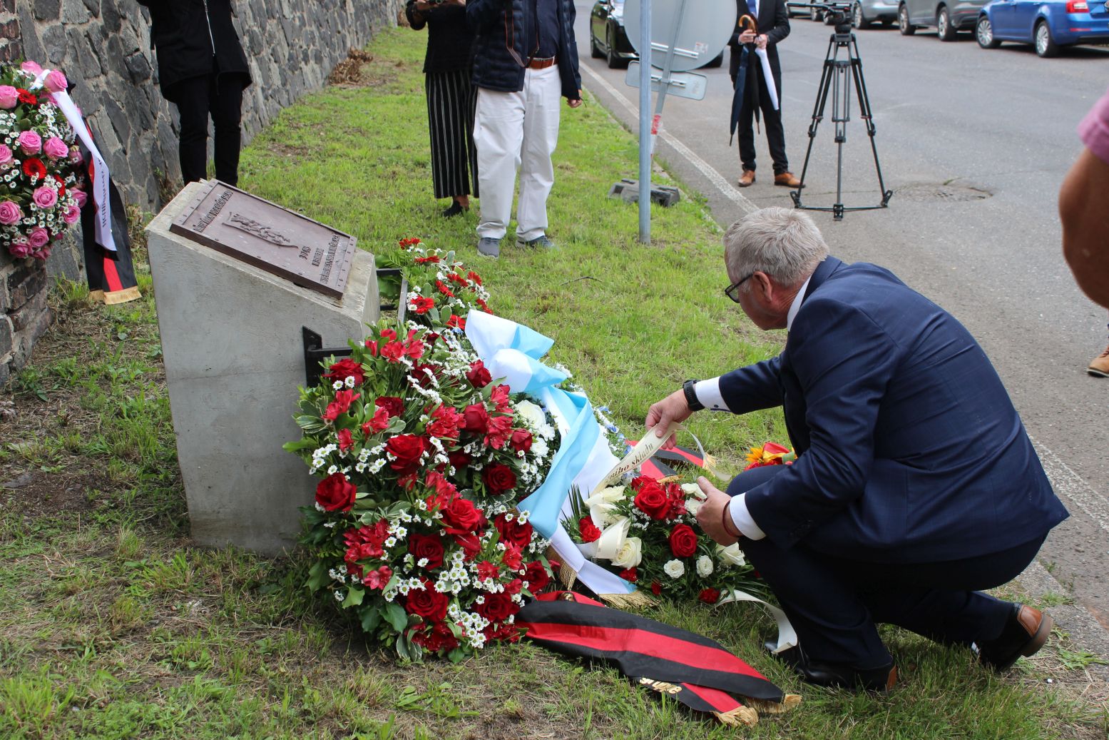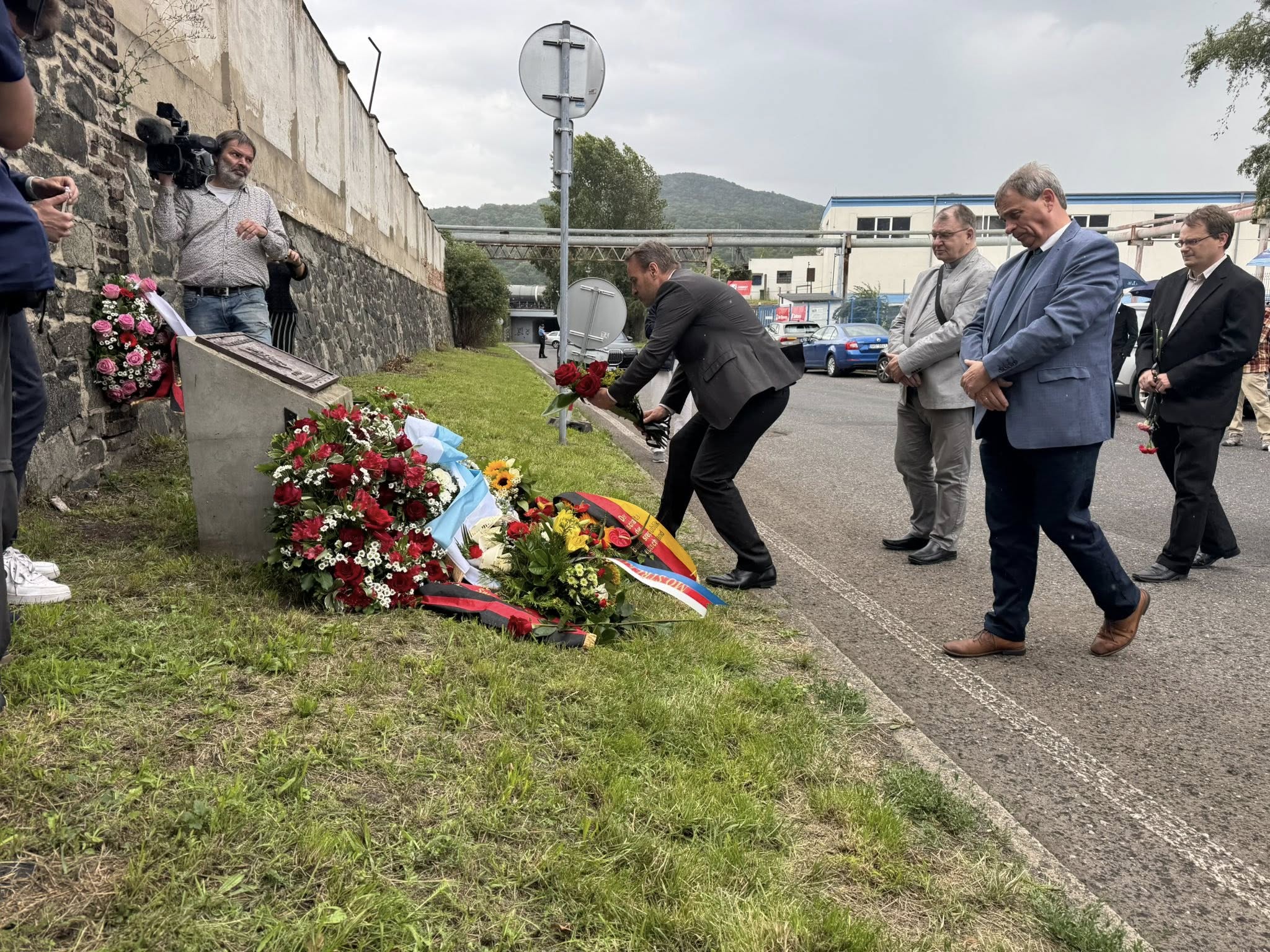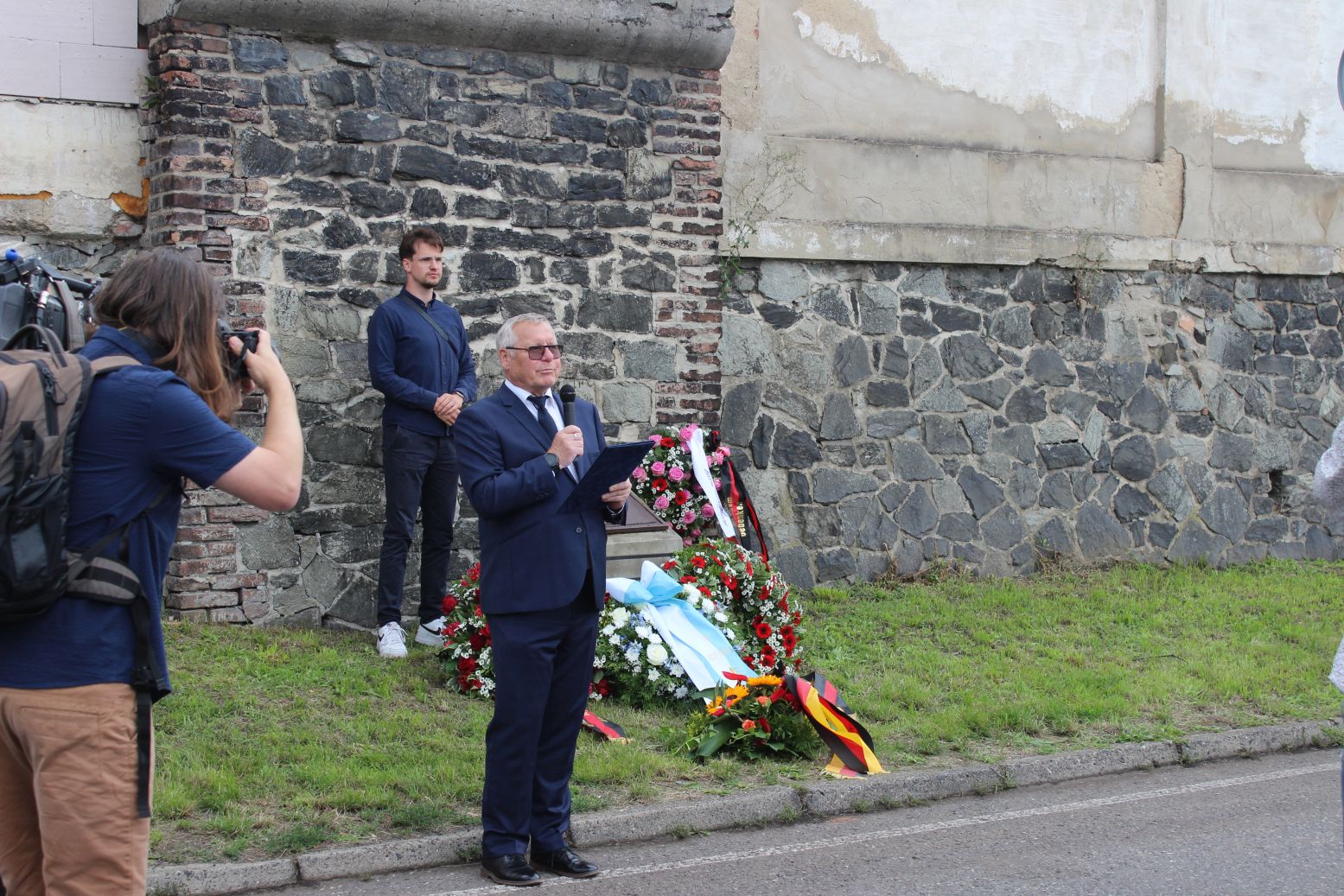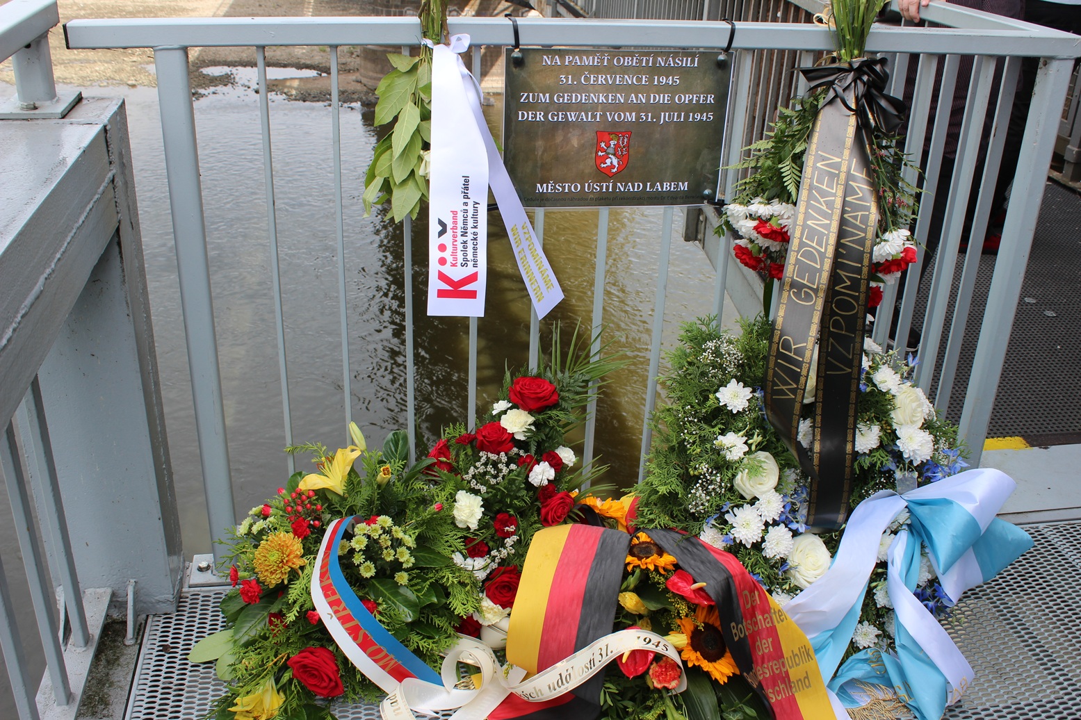 Um der Ereignisse zu gedenken und ein Zeichen für die deutsch-tschechische Versöhnung zu setzen, versammelten sich am 31. Juli um 14 Uhr auf Einladung des Kulturverbands, der Stadt Aussig sowie des Heimatkreises Aussig rund 50 Menschen vor der alten Zuckerfabrik. Nach mehreren Ansprachen und einem gemeinsamen Gebet wurden Blumenkränze an der Gedenktafel niedergelegt. Die Rednerinnen und Redner betonten die Bedeutung einer Erinnerungskultur, die auf Verständigung statt Vergeltung setzt. „Die Toten von Aussig dürfen nicht vergessen werden. Ihre Namen mögen verloren gegangen sein, doch ihr Leid verpflichtet uns. Es verpflichtet uns zur Wahrheit, zur Erinnerung und zur Menschlichkeit. Unser Gedenken gilt den Opfern, doch es richtet sich auch an die Lebenden“, sagte Steffen Hörtler, Stiftungsdirektor der Stiftung Sudetendeutsches Bildungswerk und stellvertretender Bundesvorsitzender der Sudetendeutschen Landsmannschaft.
