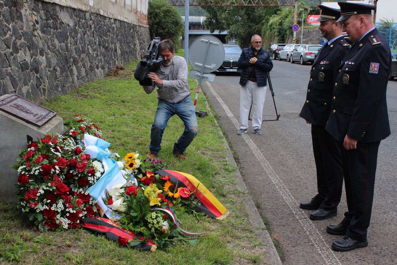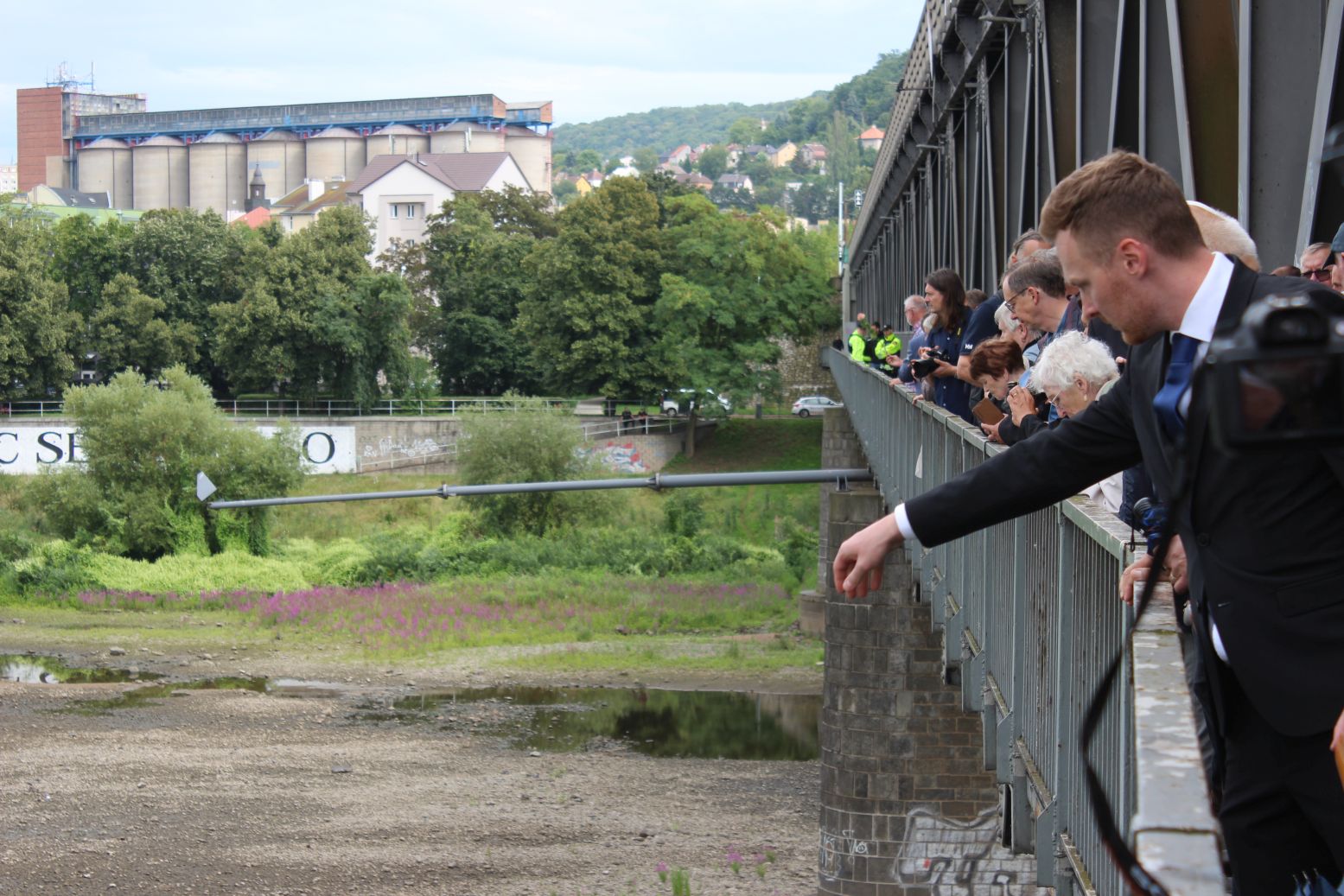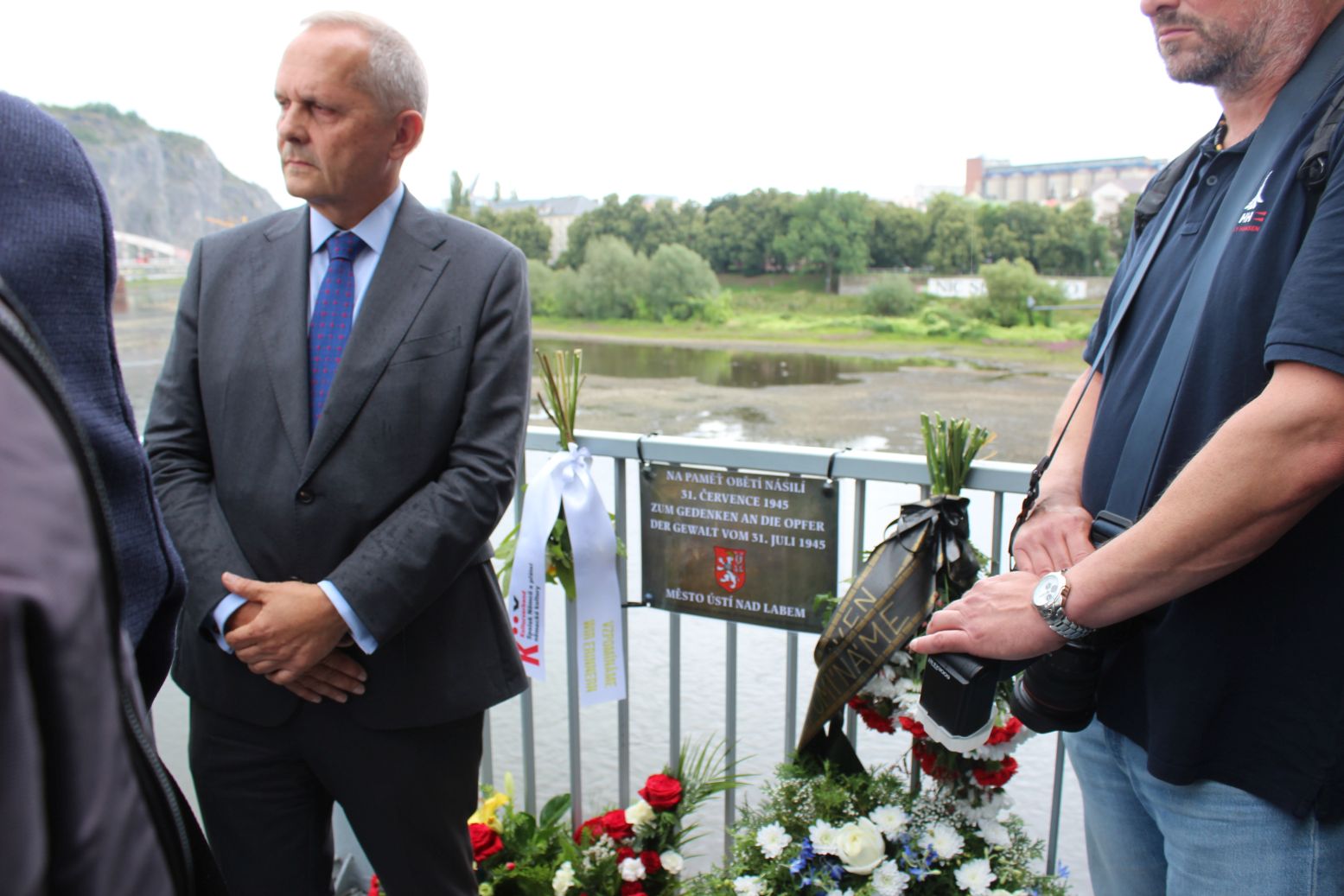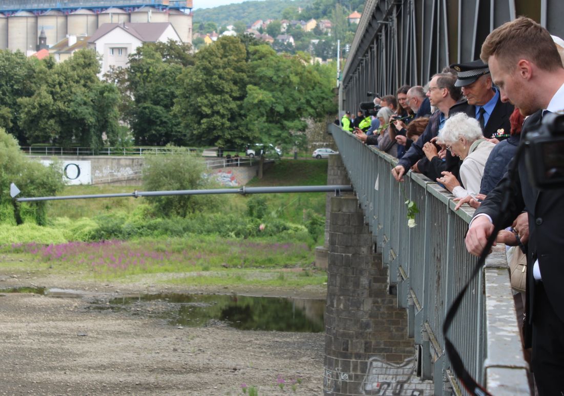 Der zweite Teil der Gedenkfeier findet üblicherweise an der Gedenktafel auf der Edvard-Beneš-Brücke statt. Da die Brücke derzeit saniert wird, trafen sich die Teilnehmenden stattdessen an der Eisenbahnbrücke, wo provisorisch eine Nachbildung der Gedenktafel angebracht wurde. Dort sprachen unter anderem die Zeitzeugin Brigitta Gottmann, die ihre persönlichen Erinnerungen teilte, und Radek Novák vom Kulturverband, der an die Menschlichkeit als Rezept gegen den Hass appellierte: „Lasst uns alle anfangen, Mensch zu sein, und seid Menschen!“