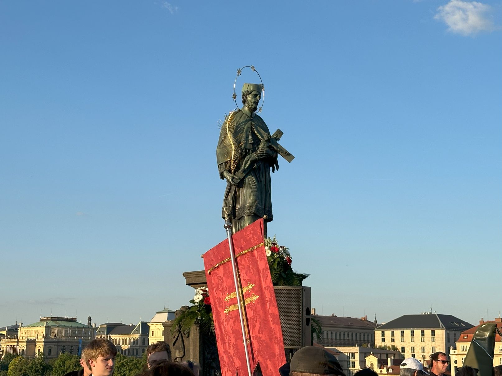 Johannes von Nepomuk ist ein bekannter Priester und Märtyrer der katholischen Kirche, der im 14. Jahrhundert lebte. Gläubige sehen ihn als Beschützer vor Überschwemmungen und Ertrinken. Das kommt aus einer Legende: König Wenzel IV. soll ihn gefoltert haben und dann von der Karlsbrücke in die Moldau werfen lassen, weil er vermutete, dass seine Frau ihren Beichtvater Nepomuk in ihre Geheimnisse einweihte. Der Monarch befürchtete, er würde mit ihr zusammen gegen ihn konspirieren. 1729 wurde Johannes von Nepomuk heiliggesprochen. Statuen wie auf der Karlsbrücke wurden schon lange vor seiner Heiligsprechung errichtet, denn er war in Böhmen als Priester sehr beliebt. Seit 1683 steht an genau der Stelle, an der Nepomuk damals angeblich in die Moldau geworfen wurde, seine Bronzestatue.